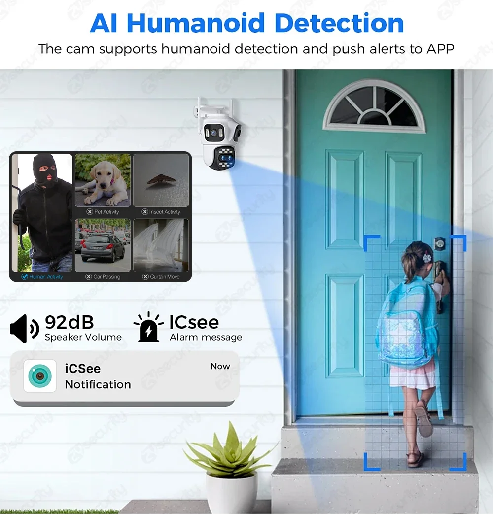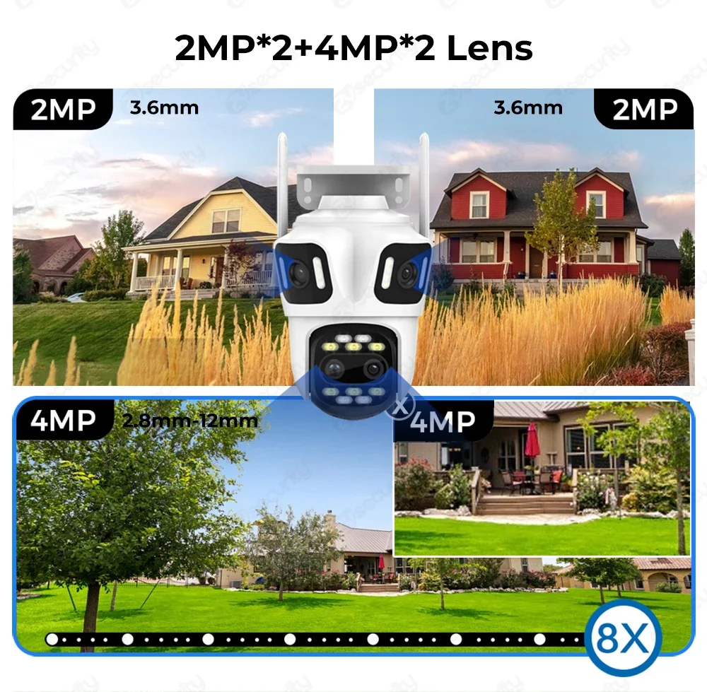 كاميرا مراقبة واي فاي خارجية 4 عدسة 4 شاشة تكبير هجين 8X كاميرا IP PTZ تعقب تلقائي كشف الإنسان أضواء كاشفة وإنذار صفارة الإنذار اتجاهين الصوت كاميرات مراقبة القبة iCSee